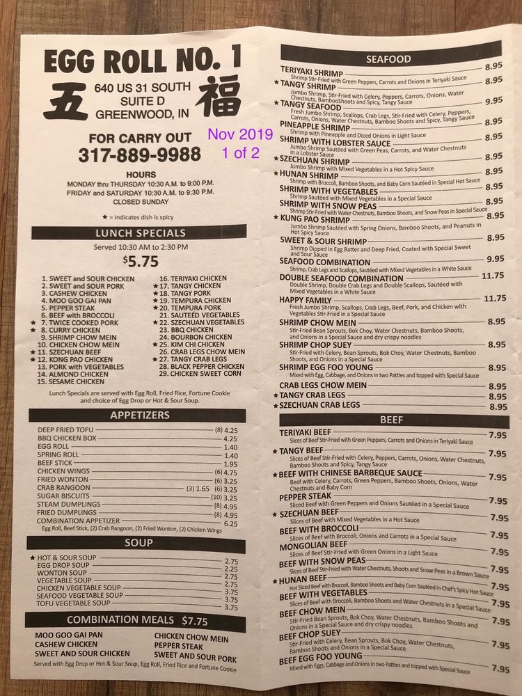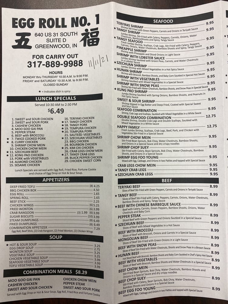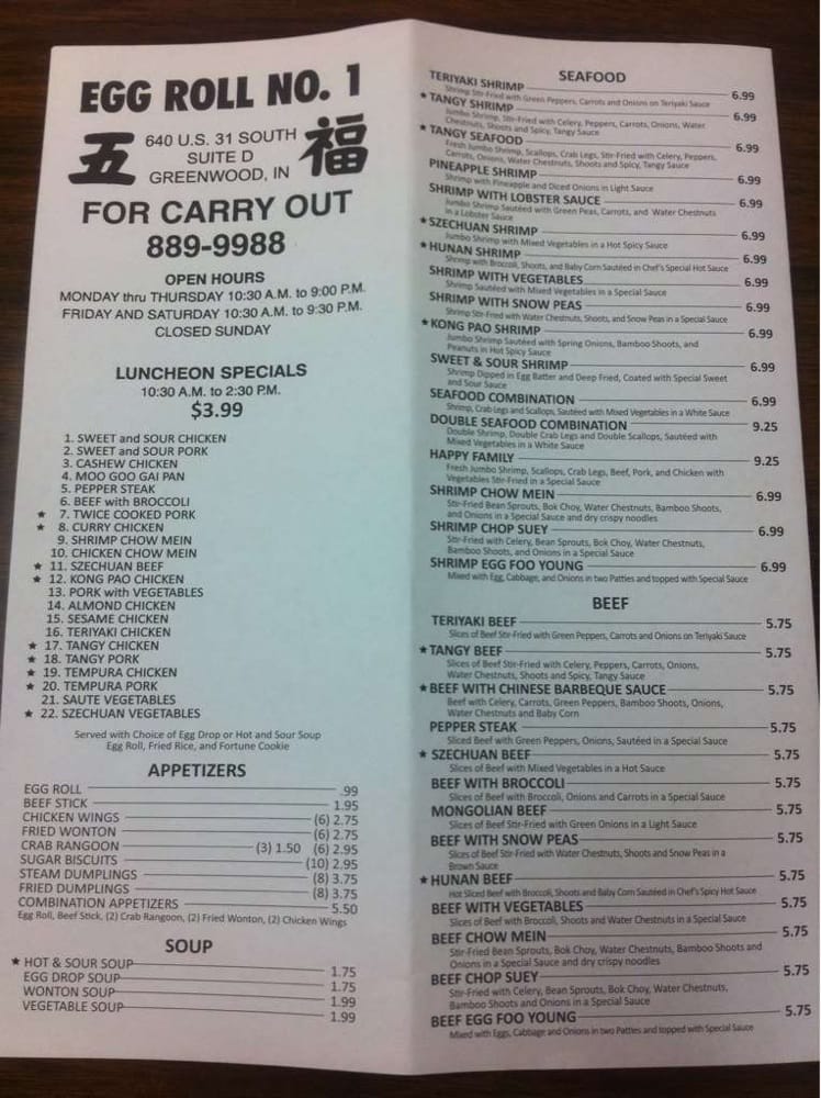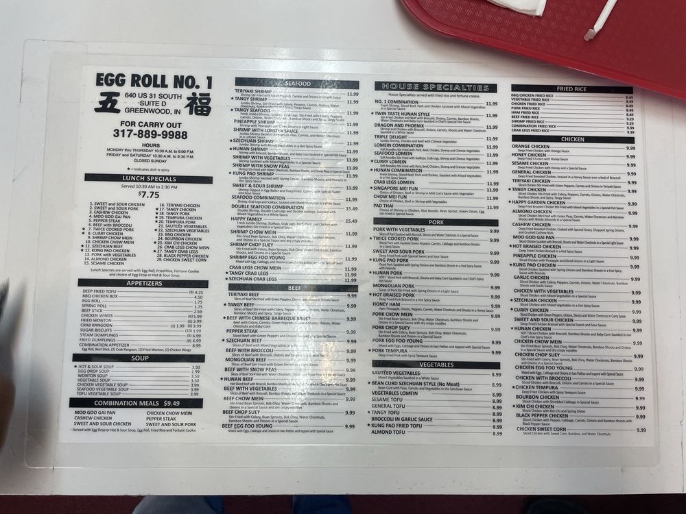 Egg Roll Number 1, a Chinese restaurant located in Greenwood, IN, offers a variety of dishes with many vegetarian options. Customers rave about the excellent service and quick order turnaround. The menu includes classic Chinese dishes like General Tso's Chicken, Sesame Chicken, and Chicken Fried Rice. While some reviewers noted inconsistencies in the chicken dishes, overall, the food is praised for its flavor and value. The restaurant has a cozy dining area and also offers takeout and delivery options. With lunch specials and affordable prices, Egg Roll Number 1 is a popular choice for those craving Chinese cuisine in the area. Don't miss out on their egg rolls, which are a must-try according to satisfied customers. Explore their menu for a delicious dining experience that won't disappoint.